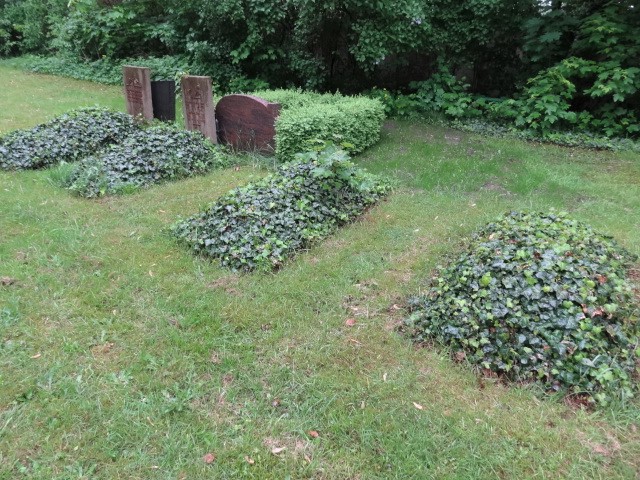 Sowie ein Kriegsgrab mit einem Grabkissen ohne Schrift und weitere Kriegsgräber mit nicht erkennbarer Zuordnung. Ergänzungen in Blau: Daten aus www.volksbund.de/graebersuche.