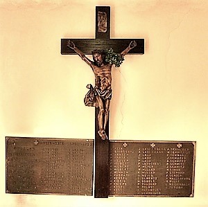 Im Eingangsbereich der Pfarrkirche an der Wand ein Holzkreuz mit Korpus wohl aus Metall. Zu