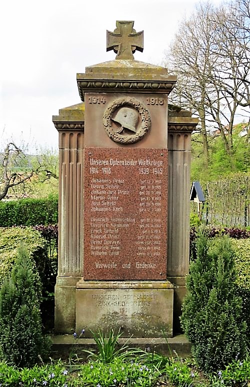 Denkmal aus Sandstein. Oben ein deutsches Kreuz. Darunter die Jahreszahlen 1914 1918, ein Helm