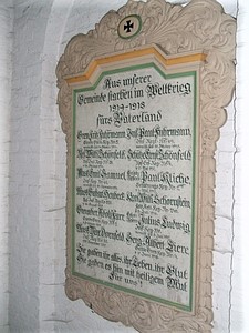 Aus unserer Gemeinde starben im Weltkrieg 1914 – 1918 fürs Vaterland. (Namen) Sie gaben ihr Alles, Ihr Leben, ihr Blut. Sie gaben es hin mit heiligem Mut. Für uns!