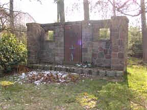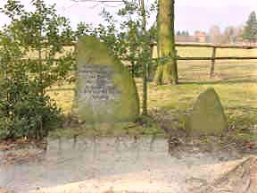 Vor dem Ort an der Hauptstraße liegt ein bewaldeter Hügel, dort führt ein gerader Weg zum Denkmal aus Feldsteinen hinauf. Es bildet eine Mauer mit zwei Fensteröffnungen und einer Gedenktafel mit Kreuz in der Mitte. Vor der Tafel liegt eine weitere mit der zweiten Inschrift.