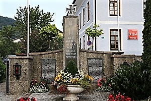 Bei der Kirche; Betonwand mit Gedenktafeln, in der Mitte Säule mit Inschrift und Tafel für die Stalingradopfer; zusätzlich Hinweise zu Soldaten von privaten Gedenksteinen