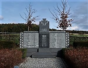 Mormorplatte mit einem Kreuz Jahreszahlen, darunter ein Schwert. Angefügt zwei Gedenkplatten.