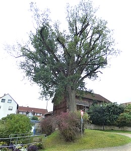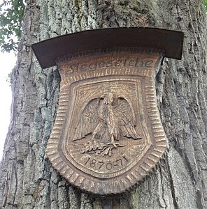 Windischenlaibach, Gemeinde Speichersdorf, Landkreis Bayreuth, Oberfranken, BayernPLZ 95469 In der Ortsmitte steht die sogenannte Siegeseiche. Ein angebrachtes Holzschild zeigt einen geschnitzten Adler der ein Eichenlaub in den Klauen hält.