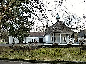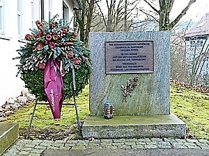 Winterbach (Heimatvertriebene), Rems-Murr-Kreis, Baden-WürttembergPLZ 73650 Friedhof. Stein mit bronzener Gedenktafel und bronzenem Rosenstrauch neben der Aussegnungshalle