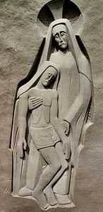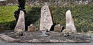 Wirft, Verbandsgemeinde Adenau, Landkreis Ahrweiler, Rheinland-PfalzPLZ 53534 Neben St. Bartolomäus ein Denkmal für die Kriegstoten der beiden Weltkriege. Das Denkmal besteht aus drei an der Frontseite geglättete, sonst unbearbeitete Felsbrocken, dazwischen zwei kleine Steine mit den Jahreszahlen 1914-1918 und 1939-1945. Aus dem mittleren Stein ist eine Figur herausgearbeitet, die wohl Jesus darstellt, der einen zusammensinkenden Mann, der nur mit einem Schutz bekleidet, ist im Arm hält. Darunter eine Widmung. Auf den beiden Steinen rechts und links nur die Namen der Gefallenen. Ein baugleiches Denkmal steht in Kirchsahr; beide stammen von dem Steinmetz und Bildhauer Kaspers aus Schuld/Ahr.