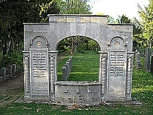 Auf dem neuen jüdischen Friedhof Denkmal für die gefallenen Soldaten jüdischen Glaubens aus Worms im ersten Weltkrieg. Verzierter Torbogen mit Namen rechts und links eingraviert. Dahinter Kriegsgräber.