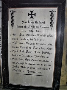 Denkmal für die Gefallenen des Ersten Weltkriegs: großes Granitkreuz mit Steinbögen im Halbrund dahinter. Die alten Namenstafeln und Inschriften sind zerschlagen und es wurde eine allgemeine Inschrift für alle Kriegsopfer angebracht. Gedenktafeln in der Kirche. Kriegsgräberstätte.
