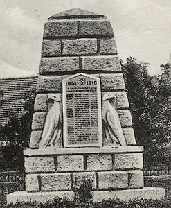 Zatten (poln. Zatom), Landkreis Arnswalde (Powiat Choszczenski), PommernDenkmal für die Gefallenen des 1. Weltkriegs. Aus Natursteinen gemauerte stumpfe Pyramide. Eingelassene Namenstafel flankiert von zwei Adlern.