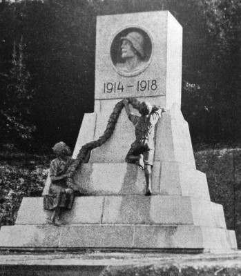 Die historische Aufnahme entstammt dem Buch „Deutscher Ehrenhain für die Helden von 1914/18“ im Dehain Verlag, Leipzig 1931. Die Bronzefiguren können schon vor 1945 zu Kriegszwecken eingeschmolzen worden sein.