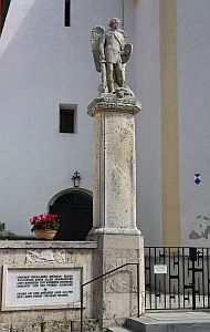 Statue des heiligen Georg auf einer Steinsäule, an der Wand daneben eine Inschriftentafel. Auf der