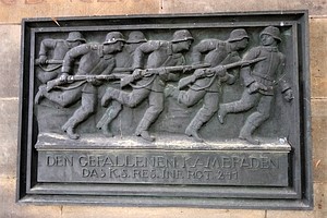 Metall- und Steintafeln mit Reliefdarstellungen und Widmung (etwa 30 an der Gedenkwand und der vorderen Stützmauer) der Regimenter und Verbände