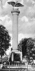 Denkmal für die Gefallenen des Krieges 1870/71: Quader mit Widmungs- und Namenstafeln, darauf hohe klassische Säule mit krönendem Adler (abgerissen).