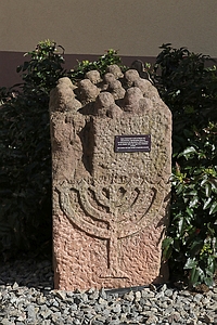 Plakette: Dieser Gedenkstein wurde im Rahmen des Ökumenischen Jugendprojektes Mahnmal zur Erinnerung an die deportierten Juden aus Baden am 22. Oktober 1940 in das Lager Gurs, Frankreich errichtet. Viele starben dort oder wurden in Auschwitz ermordet.