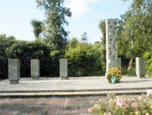Säule mit Widmung. Auf der rechten Seite die Jahreszahlen 1914 1918, schräg rechts hinter der Säule zwei Quader mit Namen; auf der linken Seite der Säule die Jahreszahlen 1939 1945, schräg links hinter der Säule drei Quader mit Namen.