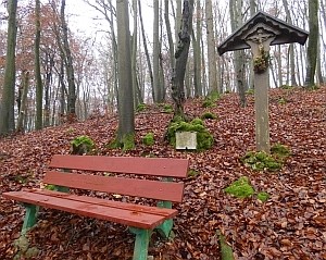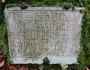 In einem Stein ist eine Gedenktafel eingelassen, daneben steht ein Kruzifix.
