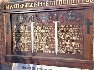Im Weltkriege 1914-18 fanden den Tod Hohenfelde (Namen) Neu-Hohenfeld (Namen) Althof (Namen)