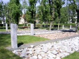 Kriegsgräberanlage auf dem Gelände des Krankenhauses Arnsdorf. 12 Granitsäulen und 6 Einzelgrabmale mit 160 Namen.