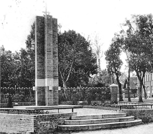 Denkmal für die Gefallenen des 1. Weltkriegs: Aus Ziegelsteinen gemauerte Stele mit vier Flügeln und krönendem Schwert (abgerissen).