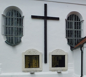 Kriegerdenkmal an der Außenseite der Kirche St. Stephan. In der Mitte ein großes Kreuz neben diesem zwei eingerahmte Gedenktafeln.