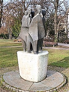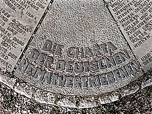 Bad Cannstatt (Heimatvertriebenen-Denkmal), Stadt Stuttgart, Baden-WürttembergPLZ 70372 Kurpark. Die Bronzeskulptur für die Heimatvertriebenen, geschaffen 1986 von der Bildhauerin Ingrid Seddig (1926 - 2008), besteht aus sechs vorwärtsschreitenden Personen. Rund um das Podest befinden sich zwölf Bodenplatten, auf elf von ihnen ist der vollständige Text der Charta zu lesen.