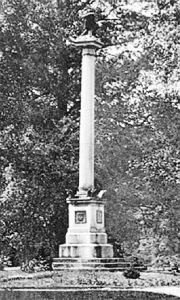 Denkmal für die Gefallenen des Krieges 1870/71: Abgestufter Quader mit eingelassenen Tafeln, darauf je eine kleine Adlerfigur auf den Ecken und hohe Säule mit krönendem Adler (abgerissen).