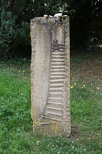 Im Friedhof, bei der Abdankungshalle; Stein mit aufsteigender Treppe, diese mündet in einem Tor mit Schienenstrang. Daneben Info-Tafel.