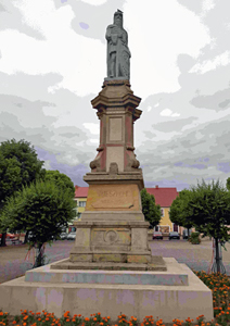 Es gedenkt nun dem Herzog von Polen Meiszko I (regierte in den Jahren 962-992) und trägt ein Standbild in Rüstung mit Schild und Schwert.