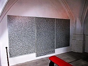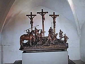 In der Pfarrkirche Unsere Liebe Frau ( Obere Pfarre) befindet sich links vom Haupteingang in einer Nische die Plastik einer Kreuzigungsszene. Links an der Wand hängt eine Tafel mit den Namen der Gefallenen beider Weltkriege der Kirchgemeinde. Rechts davon hängt eine kleinere Tafel für Bombenopfer.
