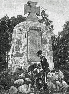 Auf dem vorliegenden Bild einer alten Postkarte sind Inschriften und Namen leider nicht lesbar. Dort waren ungefähr 30 Namen verzeichnet. Anscheinend legt darauf der berühmte Husaren-General Mackensen persönlich einen Kranz ab.