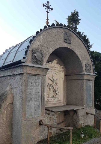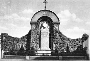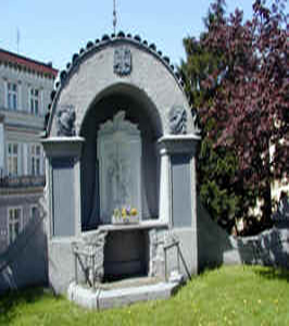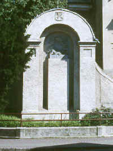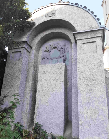 Denkmal für die Gefallenen des 1. Weltkriegs integriert in die Kirchhofmauer. Das Denkmal ist zweigeteilt an beiden Seiten der Mauer. An der Außenseite Säulen mit runder Überdachung, darunter eine Stele auf der früher ein Stahlhelm mit Eichenlaub ruhte. Dieser, sowie alle Insignien und Inschriften wurden entfernt. Auf der Innenseite des erhöhten Kirchhofs steht ein ähnlicher Bogen mit dem Relief einer Kreuzigungsszene darunter. An den äußeren Säulen wurden die Namenstafeln der Gefallenen befestigt. Im Bogen finden sich Reliefs von EK, Stahlhelm und Schwert.