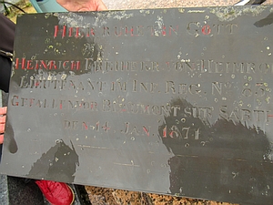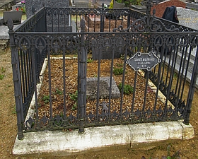 Ein Grab umrandet mit einem Metallzaun. Auf dem Grab zwei Steinplatten. Eine mit Inschrift. Am Metallzaun ist ein kleines Schild mit der Aufschrift: Tombes Militaires Loi de 4 avril 1873* angebracht.