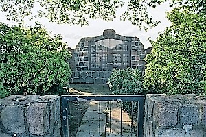 Aus Steinen gemauert mit Steintafel, an jedem Rand jeweils ein größerer Stein mit Inschrift. Alles ist umgeben von einer