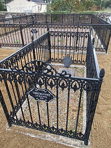Auf dem Friedhof in Beillé. Ein Grab umrandet mit einem Metallzaun. Auf dem Grab eine Steinplatte mit