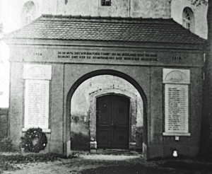 Denkmal für die Gefallenen des 1. Weltkriegs: Torhaus als Eingang zum Kirchhof mit beidseitigen Namenstafeln und Stahlhelm-Reliefs. Über dem Torbogen die Inschrift (abgerissen).