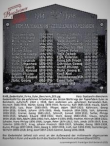 Steinerne Platten aus dunklem Stein mit weißer, eingemeißelter Schrift. Ehemals am Firmengebäude der stillgelegten und abgerissenen Papierfabrik Euler in Bensheim angebracht. Als im Rahmen des Abrisses des gesamten Firmengeländes auch die Namenstafeln entfernt werden mussten, wurden diese durch das Stadtarchiv Bensheim in Verwahrung genommen. Etliche der Namen befinden sich auch auf den Gedenktafeln an der Säule des Ehrenfriedhofes auf dem Bensheimer Friedhof, vorausgesetzt, dass diese auch aus dem damaligen Bensheimer Stadtgebiet stammten. Andere Mitarbeiter, die aus Gemeinden kamen, die damals noch nicht zu Bensheim gehörten, wurden auf dem Bensheimer Ehrenfriedhof nicht erwähnt, ihre Namen lassen sich jedoch teilweise an entsprechenden Ehrenmalen der jeweiligen Gemeinden finden.