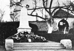 Denkmal für die Gefallenen des 1. Weltkriegs: breiter Obelisk auf abgestuftem Sockel mit Stahlhelm Relief, gekrönt von einem EK-Zeichen.