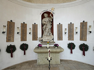 In der Gedenkkapelle bei der alten Pfarrkirche sind die Gefallenen und Vermissten des 1. Weltkriegs auf Platten verzeichnet. In der Mitte der Wand ist der Erzengel Michael dargestellt, der den Satan tötet.