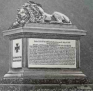 Denkmal für die Gefallenen des Garde-Schützen Bataillons in Kriege 1870. Quader mit krönender liegender Löwenfigur (nicht mehr vorhanden).