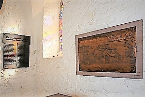 Gedenkstätte im alten Kirchturm, im Innern eine Truhe, eine Statue und zwei Tafeln an der Wand