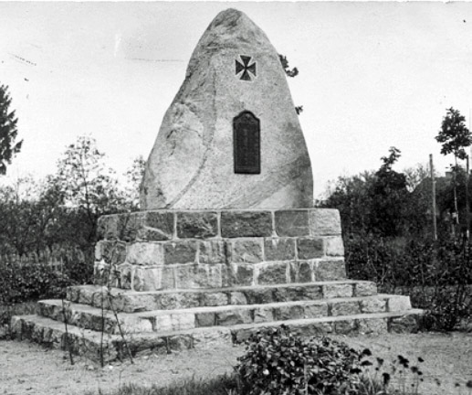 Denkmal für die Gefallenen des 1. Weltkriegs: Abgestufter Sockel aus Natursteinen mit aufgesetztem großen Findling mit Widmungs- und Namenstafel und EK-Zeichen (abgerissen).