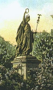 Denkmal für die Gefallenen der Stadt im Kriege 1870/71: Sockel mit Inschriften und krönender Germania Figur, die eine Adler-Standarte und einen Lorbeerkranz hält (abgerissen).