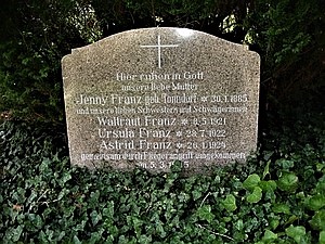 Hier ruhen in Gott unsere liebe Mutter (Name) und unsere lieben Schwestern und Schwägerinnen (Name) gemeinsam durch Fliegerangriff umgekommen am 5. 3. 1945