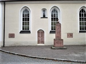 An der Kirche befindet sich ein Obelisk aus rotem Stein. Am Sockel zeigt sich eine Widmung, oben an zwei Seiten Namen von Gefallenen des Ersten Weltkriegs. An der gegenüberliegenden Kirchenwand befinden sich zwei Tafeln mit weiteren Namen von Gefallenen des Ersten Weltkriegs, eine Tafel mit selbigen des Krieges 1870 und eine weitere mit Widmung Zweiter Weltkrieg. 50 m davon entfernt steht noch ein Gedenkstein für die Feuerwehr.