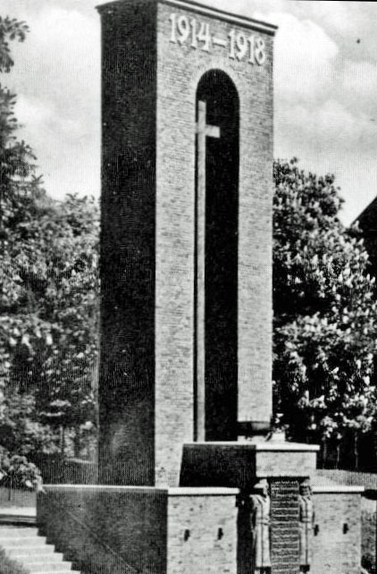 Ehemaliges Denkmal für die Gefallenen des 1. Weltkriegs: Aus Ziegelsteinen gemauerter Balkon mit darauf stehendem hohem Turm. Darin eingelassen ein Kreuz in voller Höhe. Unten am Vorsprung zwei große Soldatenfiguren mit Inschrift dazwischen.