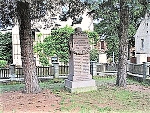In Ortsmitte steht das gepflegte Denkmal, ca. 1,5 m hoch, aus rotem Stein, gekrönt von einem Eisernen Kreuz, darunter Relief eines Eichenlaubkranzes.