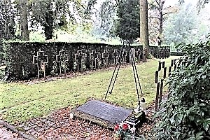 Im Friedhof Brötzingen, zwei Gräberreihen mit Metallkreuzen und dazwischen am Boden Namenssteine.