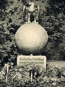 Denkmal für die Gefallenen des 1. Weltkriegs aus Buch im Schlosspark: Quader mit aufgesetzter Weltkugel und krönendem Adler (abgerissen).