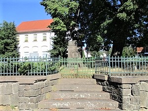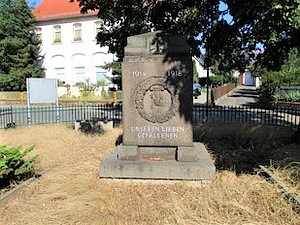 Im Dorfzentrum steht ein Granitquader, oben Relief von Eisernem Kreuz und Eichenlaubkranz, zwei Seiten mit Namen, zwei mit Inschriften.