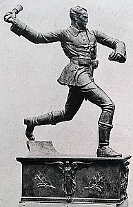 Denkmal für die gefallenen Angehörigen der Technischen Hochschule Berlin im Lichthof der Universität: Quader mit verziertem bronzenem Aufsatz und krönender Figur eines Handgranatenwerfers (vernichtet).